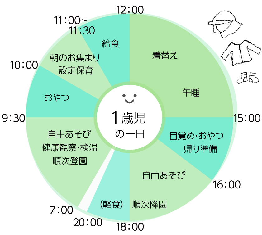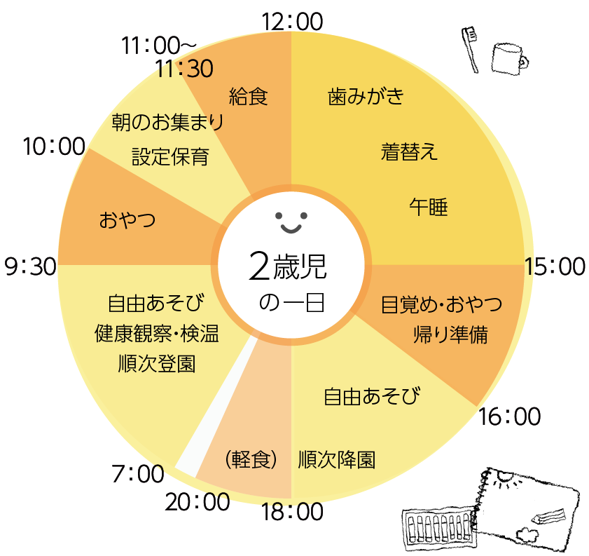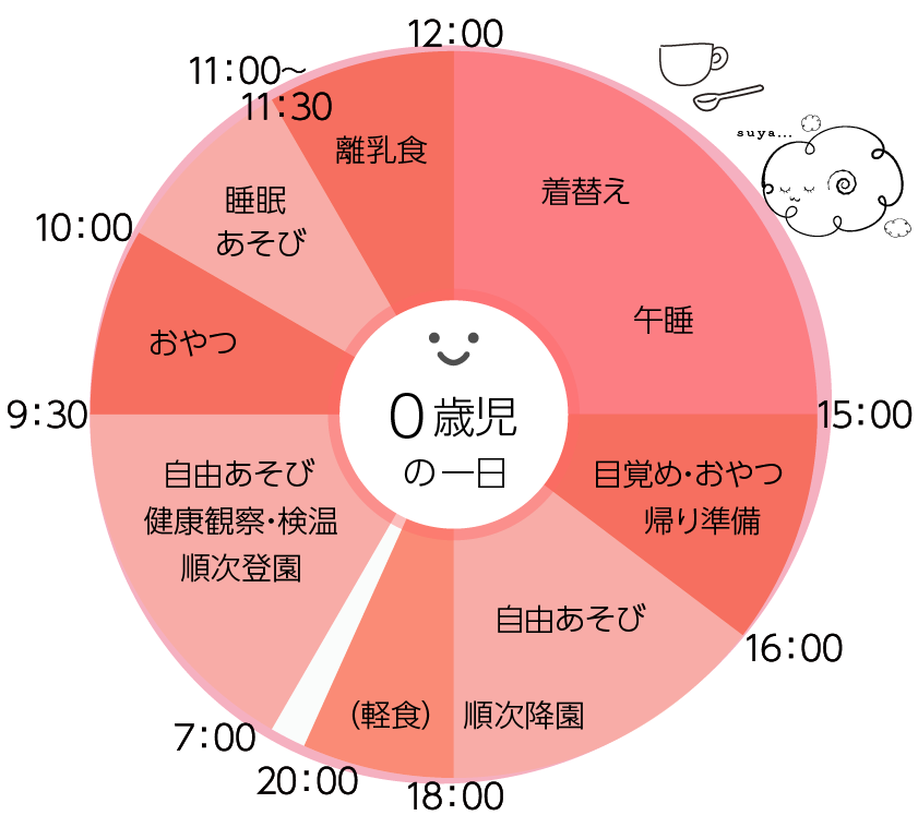 あさがお保育園タイムスケジュール 一日の流れ 乳児は一人ひとり生活のリズムが違います。それぞれの発達に合わせて、園生活が送れるように配慮します。 ☆ 時間は目安なので多少前後します。 ☆ オムツ交換、排泄は適宜行います。 ☆ トイレトレーニングは個々に応じて無理のないように進めていきます。